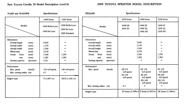 The new "Corolla 30" series comprises sedans, hardtops and vans, while the new "Sprinter" series consists of sedans and coupes. Some models of the previous Corolla 20 series will be sold concurrently with the new "Corolla 30" models.