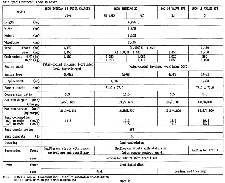 - Type 4A-GE (1.6-liter, in-line, 4-cylinder engine, maximum output 160ps/7400rpm)The new Type 4A-GE employs a five-valve system (three intake and two exhaust valves) to create higher.output and response through greater intake and exhaust efficiency. A variable valve-timing (WT) mechanism for two-step control of the opening and closing of intake valves according to driving conditions, independent cylinder throttles, and dual mufflers for increased exhaust efficiency are also newly adopted. The result is a high-performance sporty engine developing 100ps/liter of displacement, without turbo-or supercharging.
